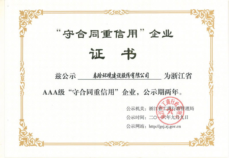 2016年浙江省AAA级“守合同重信用”企业(公示期两年)