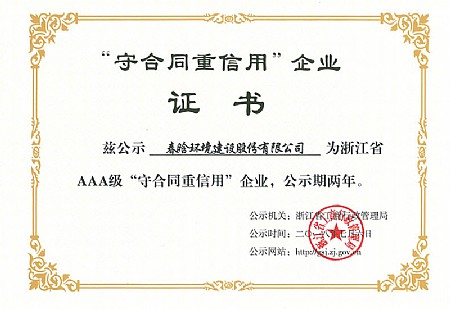 2013年浙江省工商企业信用AAA级“守合同重信用”单位(有效期三年)
