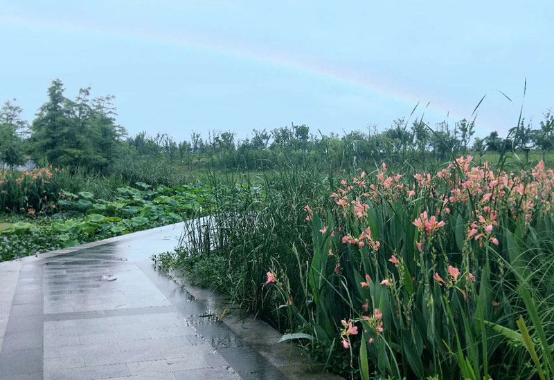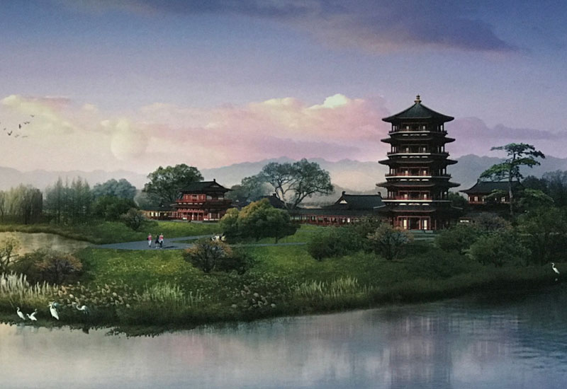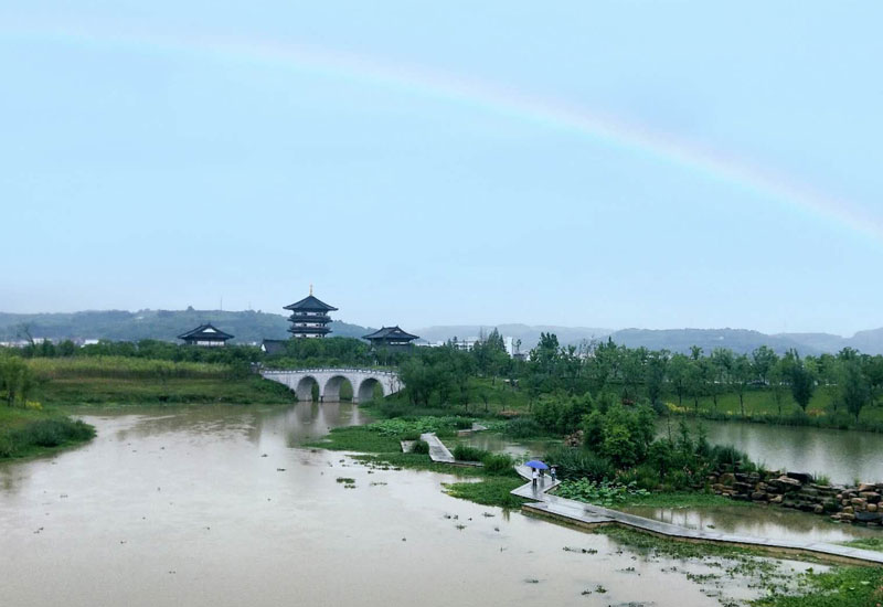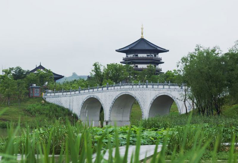 该工程建筑面积14117平方米,建筑地点位于嵊州市曹蛾江与老黄泽交汇处,是嵊州重点工程 ,围合面积近四千亩,公园集“水利、旅游、景观、生态、文化”等功能于一体的城市湿地公园。公园主要建筑以“仿唐”仿古建筑为主,公园的标志性建筑是诗画中心五层楼的蕴秀阁,高约40米,建成后将是浙江省最大的仿唐风古建筑。公园规划植物品种600多种,四季花海16万平方米,是嵊州最大的水岸花海和植物博览园。它是一项提高滞洪区防洪能力,为人民群众提供休闲娱乐场所的名声工程,也是嵊州市最大的综合性市民公园。